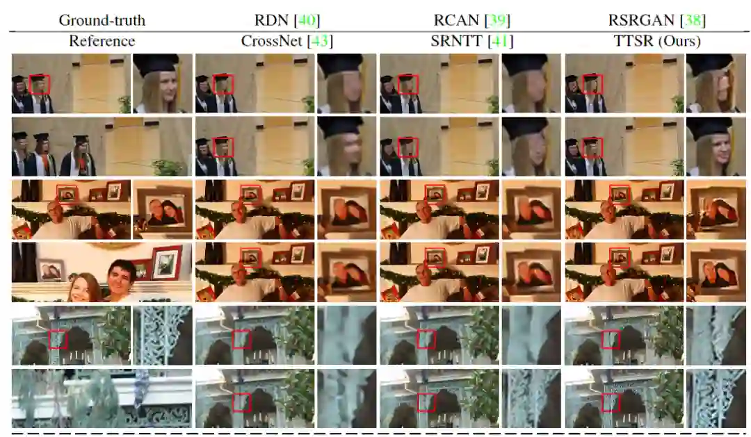 图1.提出的TTSR和最新的RefSR方法之间的4×倍放大SR结果比较。TTSR学习从Ref图像(以绿色表示)中搜索相关纹理以寻找目标LR区域(以黄色表示),从而避免错误的纹理转移(以红色表示)。