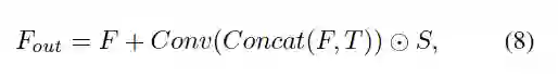 其中Si表示软注意力图的第i个位置。首先将HR纹理特征T与LR功能F融合在一起,以利用LR图像中的更多信息,而不是直接应用注意力图S,将这些融合的特征进一步与软注意图逐元素相乘,然后再添加到F中。