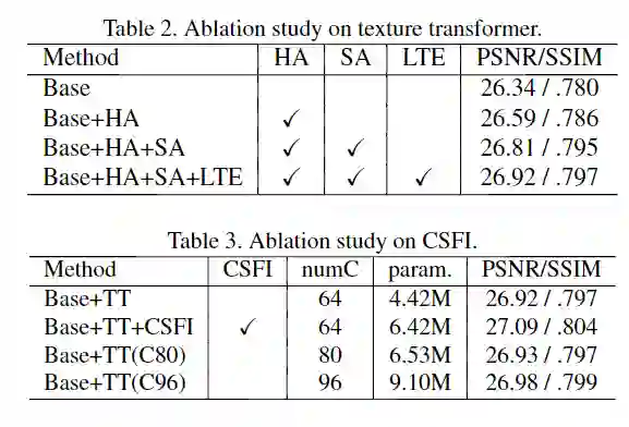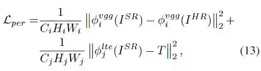 其中第一部分是传统的感知损失,其中φvggi(·)表示第i层的VGG19特征图,而(Ci,Hi,Wi)表示该层的特征图的形状。ISR是预测的SR图像。我们的感知损失的第二部分是传递感知损失,其中φltej(·)表示从LTE的第j层提取的纹理特征图,而(Cj,Hj,Wj)表示该层的形状。这种传递感知损失将预测的SR图像约束为具有与传递的纹理特征T相似的纹理特征,这使更有效地传递Ref纹理。