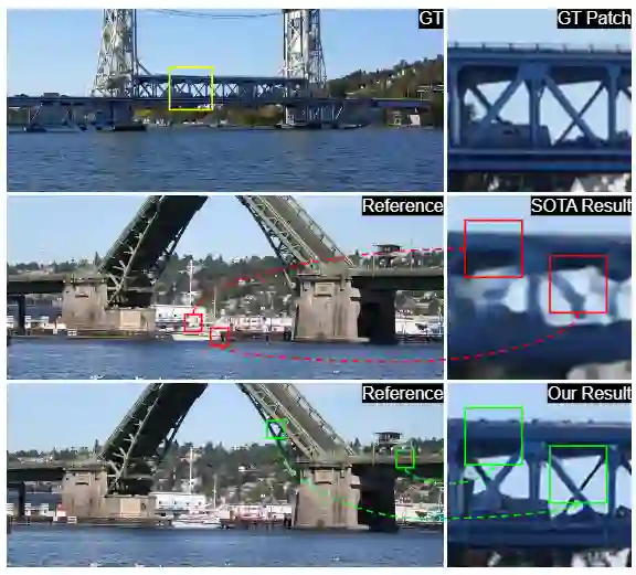但是,传统的SISR通常会导致效果模糊,因为高分辨率(HR)纹理在退化过程中被过度破坏,无法恢复。尽管提出了基于生成对抗网络(GAN)的图像SR方法来缓解上述问题,但由GAN引起的幻觉和伪像进一步给图像SR任务带来了巨大挑战。最近,基于参考的图像超分辨率(RefSR)取得了不错的进展,该方法从给定的参考Ref图像传输高分辨率(HR)纹理以产生视觉上令人愉悦的结果。但是,SOTA方法通常采用一种直接的方法来传输纹理,这可能会导致不满意的SR图像(如图1所示)。