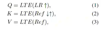 图2.提出的纹理变换器Transformer。Q,K、Vare分别是从上采样的LR图像,依次向下/上采样的Ref图像和原始Ref图像中提取的纹理特征。修正从DNN主干提取的LR特征,并进一步与传递的纹理特征T融合以生成SR输出。