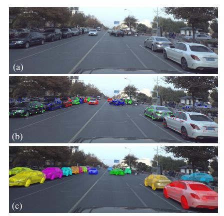 自动驾驶引起了工业界和学术界的极大关注。一项重要的任务是估计道路上移动或停放的车辆的3D属性(例如平移,旋转和形状)。这项任务虽然至关重要,但在计算机视觉领域仍未得到充分研究,部分原因在于缺乏适用于自动驾驶研究的大规模和完全标注的3D汽车数据集。在本文中,我们提供了第一个适用于3D汽车实例理解的大型数据库- ApolloCar3D。该数据集包含5,277个驾驶图像和超过6万个的汽车实例,其中每辆汽车都配备了具有绝对模型尺寸和语义标记关键点的行业级3D CAD模型。该数据集比PASCAL3D +和KITTI(现有技术水平)大20倍以上。为了在3D中实现高效标注,我们通过考虑单个实例的2D-3D 关键点对应关系和多个实例之间的3D关系来构建流程图。配备这样的数据集,我们使用最先进的深度卷积神经网络构建各种基准算法。具体来说,我们首先使用预先训练的Mask R-CNN对每辆车进行分割,然后基于可变形的3D汽车模型,使用或不使用语义关键点,对其3D姿态和形状进行恢复。我们证明,使用关键点显着提高了拟合性能。最后,我们开发了一个新的3D指标,同时考虑3D姿态和3D形状,满足全面的评估和模型简化测试。通过与人类表现的比较,我们提出了几个未来的改进方向。