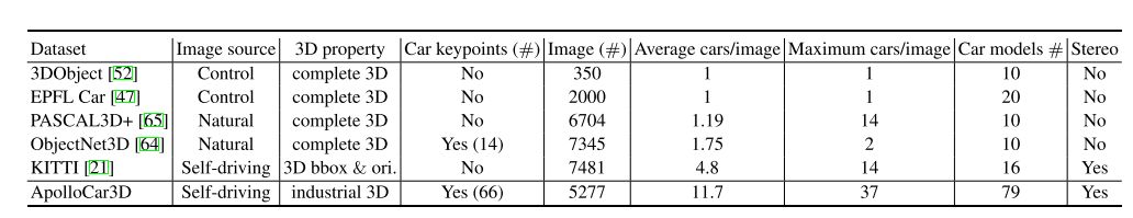 建立用于自动驾驶的大规模且不断增长的3D汽车理解数据集,即ApolloCar3D,它补充了现有的开源三维物体数据集。