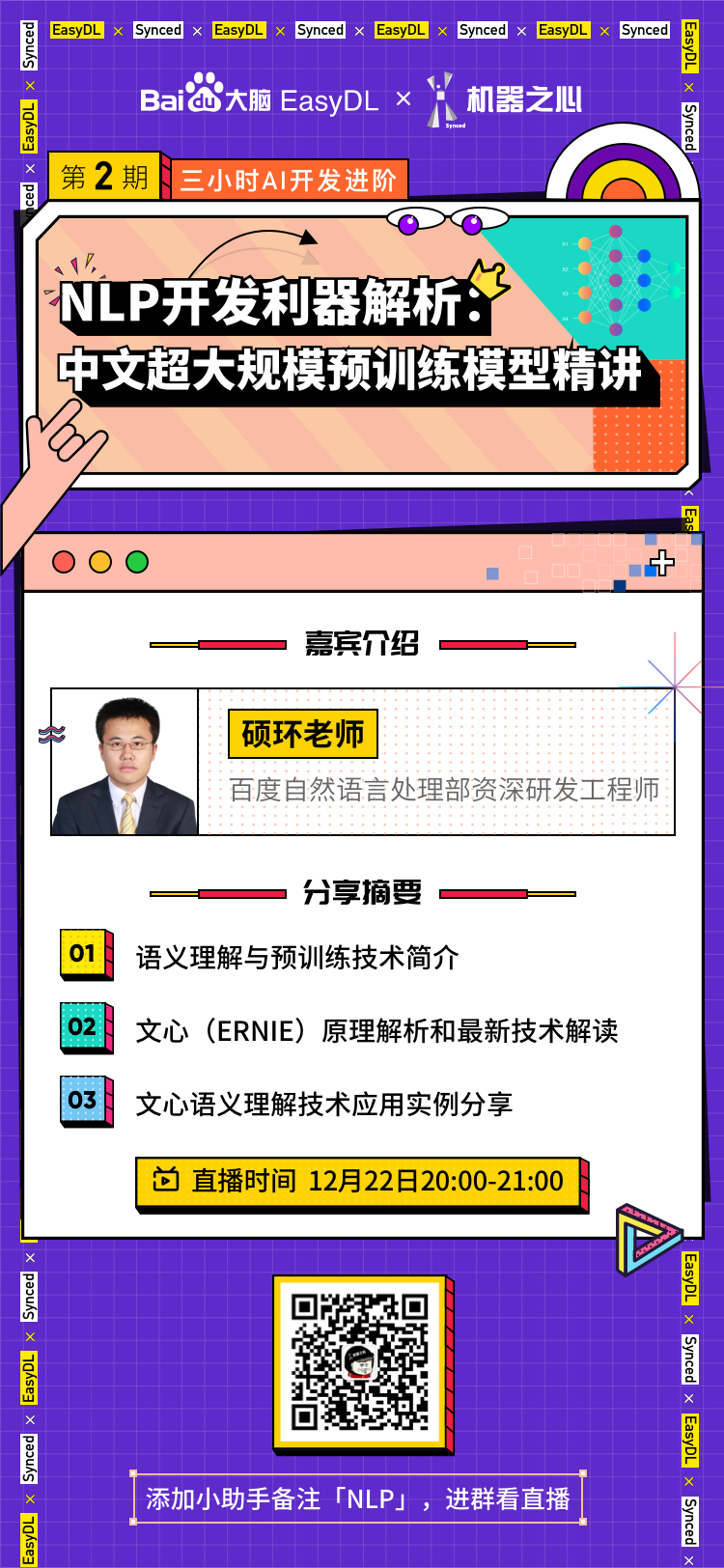 12月22日20:00,百度自然语言处理部资深研发工程师硕环老师将在第二期直播《NLP开发利器解析:中文超大规模预训练模型精讲》中介绍: