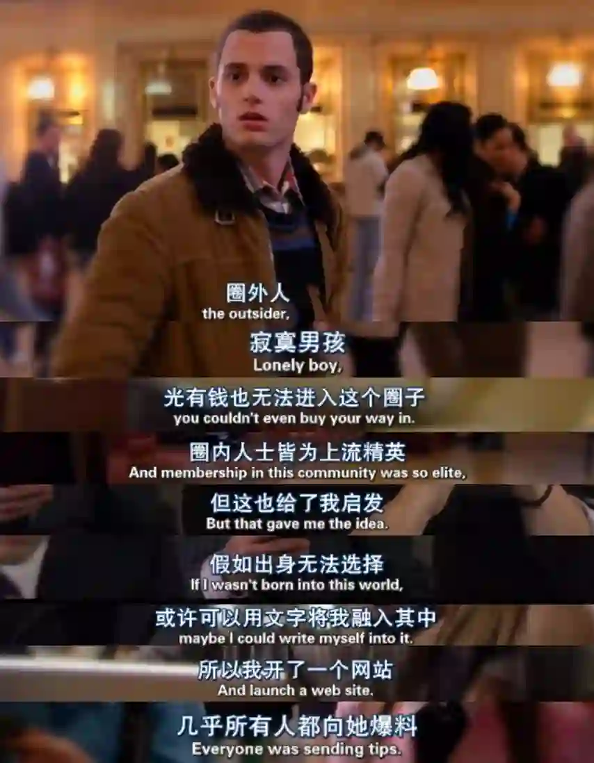 片头这个魅惑的问题,或许是《绯闻女孩》最让人印象深刻的一句台词。如果你还记得大结局,剧中那个神秘的、无处不在、自称绯闻女孩的博主……其实是孤独男孩,丹·汉弗瑞(Dan Humphrey)。他一直是个局外人,直到溜进了上东区的上流社会。