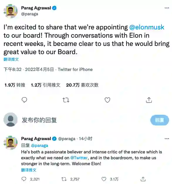 时下马斯克以第一大股东的身份加入,Twitter 现任 CEO 帕拉格·阿格拉瓦尔(Parag Agrawal)发 Twitter 表示,“通过最近几周与埃隆的对话,我们很清楚他将为我们的董事会带来巨大的价值。”