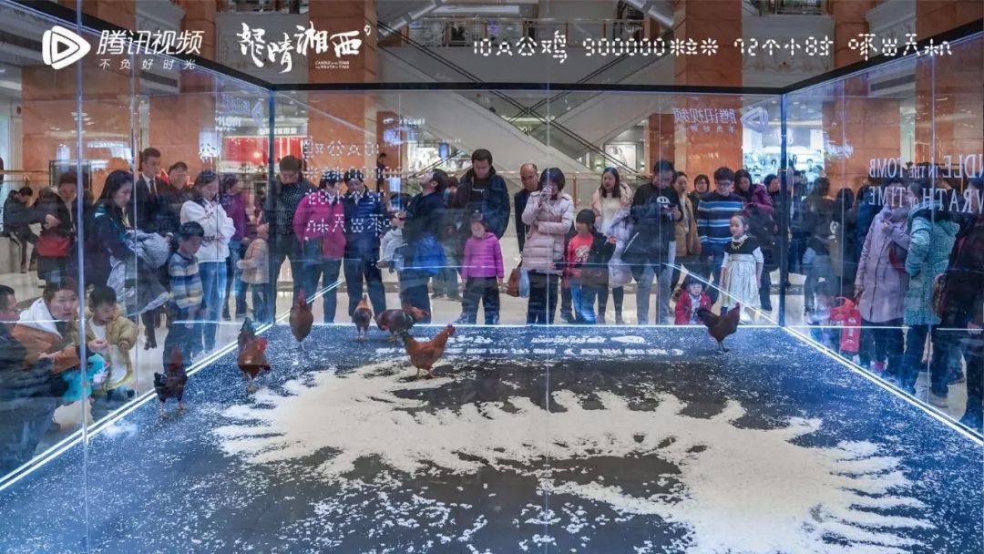 刚才说到10只鸡演员在上海月星环球港的卖力表演,其实这一切都是网剧《怒晴湘西》的第一波预热动作,让上海商场里这10只湘西公鸡在大庭广众的强势围观之下,用72小时慢慢地啄食铺满地面的900000粒大米,才会露出巨大的蜈蚣boss图形和“《怒晴湘西》腾讯视频全网独播”的关键信息。
