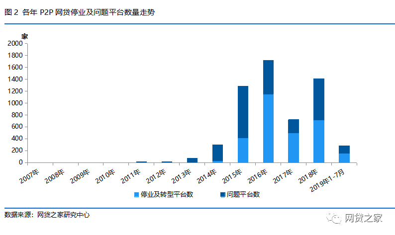 据网贷之家统计,截至2019年7月底,P2P网贷行业累计停业及问题平台数量总计达到5830家,其中问题平台2827家,停业及转型3003家。