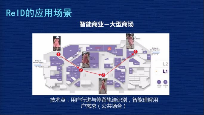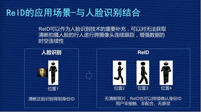 但 ReID 技术和人脸的技术可以做一个补充,当能看到人脸的时候用人脸的技术去识别,当看不到人脸的时候用 ReID 技术去识别,可以延长行人在摄像头连续跟踪的时空延续性。右边位置2、位置3、位置4 的地方可以用 ReID 技术去持续跟踪。跟人脸识别结合是大的 ReID 的应用方向,不是具象的应用场景。