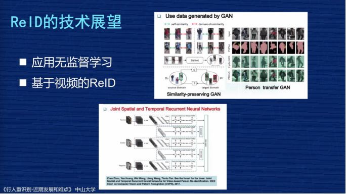 第一个,ReID 的数据比较难获取,如果用应用无监督学习去提高 ReID 效果,可以降低数据采集的依赖性,这也是一个研究方向。右边可以看到,GAN生成数据来帮助 ReID 数据增强,现在也是一个很大的分支,但这只是应用无监督学习的一个方向。