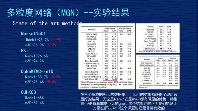1、Market1501。我们不做 ReRank 的时候,原始的 Rank1 是 95.7%,mAP 是 86.9%,跟刚才讲的业内比较好的 PCB 那个文章相比,我们的 Rank1 提高差不多 1.9 个点,mAP 整整提高 5.3 个点,得到非常大的提升。