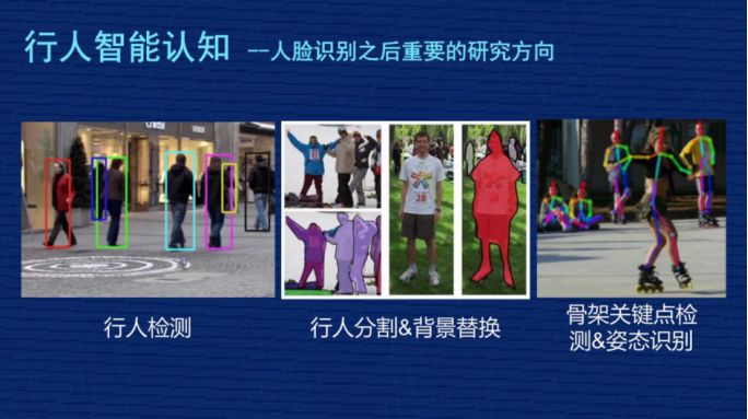 3、骨架关键点检测及姿态识别。一般识别出人体的几个关键点,比如头部、肩部、手掌、脚掌,用到行人姿态识别的任务中,这些技术可以应用在互动娱乐的场景中,类似于 Kinnect 人机互动方面,关键点检测技术是非常有价值的。