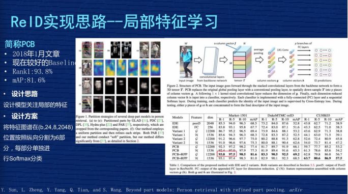 它的优化主要是在这个位置,它干了个什么事?它沿着纵向将24 平均分成 6 份,纵向就是 4,而横向是 8,单个特征图谱变为 4×8×2048,但它从上到下有 6 个局部特征图谱。6个特征图谱变为6个向量后做分类,它是同时针对每个局部独立做一个分类,这是这篇文章的精髓。这个方式看起来非常简单,但这个方法跑起来非常有效。作者报告的成果在 2018 年 1 月份时 Rank1 达到了 93.8%,mAP 达到了 81.6%,这在当时是非常好的指标了。
