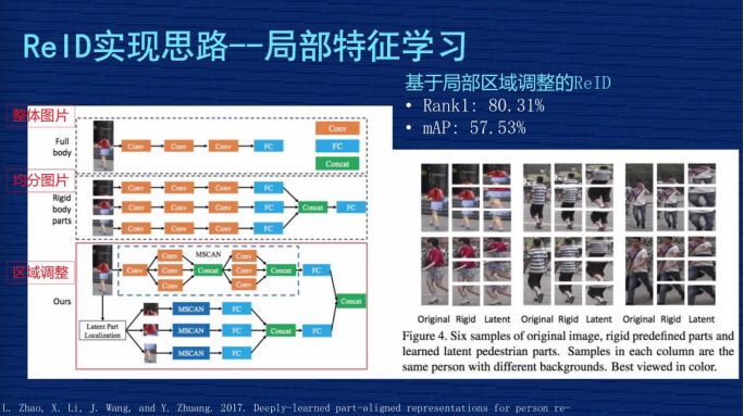 所以他设计一个模型,使得这个模型动态调整不同区域在图片中的占比,把调整的信息跟原来三分的信息结合在一起进行预估。作者当时报告的成果是 Rank1为80% 左右,mAP为57%,用现在的眼光来讲,这个成果不是那么显著,但他把图片切分成细粒度的思路给后面的研究者提供了启发,我们的成果也受助于他们的经验。