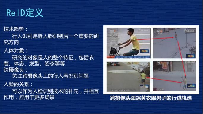 右边是 ReID 的技术特点:首先,ReID 是属于行人识别,是继人脸识别后的一个重要研究方向。另外,研究的对象是人的整体特征,包括衣着、体形、发行、姿态等等。它的特点是跨摄像头,跟人脸识别做补充。