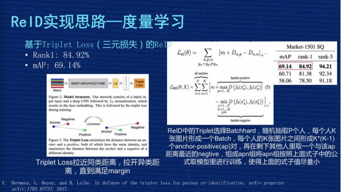 这个 Loss 怎么定义?右上角有一个公式,就是 ap 距离减 an距离,m 是一个gap,这个值尽量小,使得同类之间尽量靠在一起,异类尽量拉开。右图是 TripletLoss 的实验方案,当时这个作者报告了一个成果,Rank1 到了 84.92%,mAP 到了 69%,这个成果在他发文章的那个阶段是很有竞争力的结果。