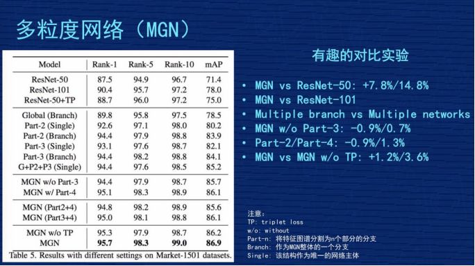这是 MGN 的网络架构完整的图,这个网络图比较复杂,第一个,网络从结构上比较直观,从效果来讲是比较有效的,如果想复现我们的方案还是比较容易的。如果你是做深度学习其他方向的,我们这个方案也有一定的普适性,特别是关注细粒度特征时,因为我们不是只针对 ReID 做的。我们设计的结构是有一定普适性,我把它理解为“易迁移”,大家可以作为参考。