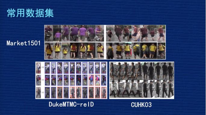 这里放三个数据集的照片在这里,上面是 Market1501 的数据集,比如紫色这个人有一些照片检测得并不好,像第二张照片的人只占图片的五分之三左右,并不是一个完整的人。还有些照片只检测到了局部,这是现在数据集比较现实的情况。