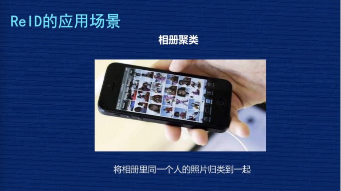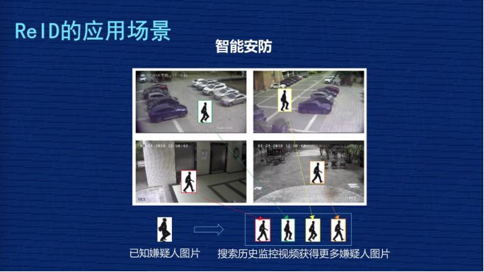 ReID 根据嫌疑犯照片,去监控视频库里去收集嫌疑犯出现的视频段。这样可以把嫌疑犯在各个摄像头的轨迹串连起来,这个轨迹一旦串连起来之后,相信对警察的破案刑侦有非常大的帮助。这是在智能安防的具象应用场景。