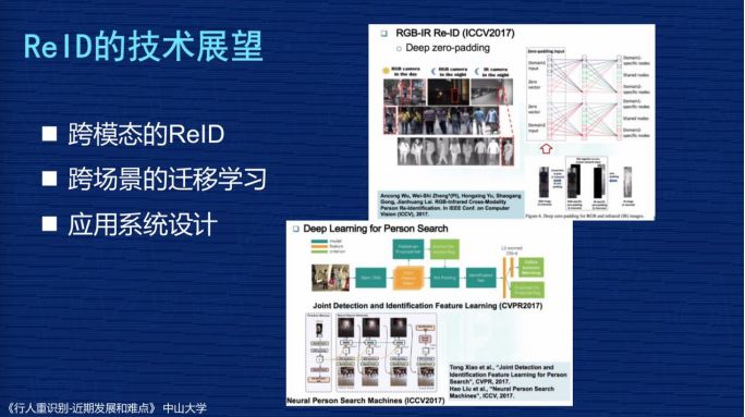 第三个,跨模态的 ReID。刚才讲到白天和黑夜的问题,黑夜时可以用红外的摄像头拍出来的跟白色采样摄像头做匹配。