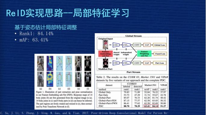 2、基于姿态估计局部特征调整。局部切割是基于图片的,但对里面的语义不了解,是基于姿态估计局部位置的调整怎么做?先通过人体关键点的模型,把这个图片里面人的关节位置取出来,然后按照人类对人体结构的理解,把头跟头比较,手跟手比较,按照人类的语义分割做一些调整,这相对于刚才的硬分割更加容易理解。基于这个调整再去做局部特征的优化,这个文章是发表在 2017 年,当时作者报告的成果 Rank1为84.14%,mAP为63.41%。