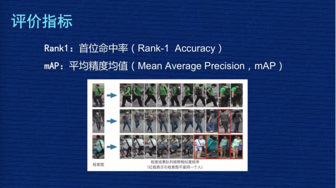 ReID 终归还是排序问题,Rank 是排序命中率核心指标。Rank1 是首位命中率,就是排在第一位的图有没有命中他本人,Rank5 是 1-5 张图有没有至少一张命中他本人。更能全面评价ReID 技术的指标是 mAP 平均精度均值。