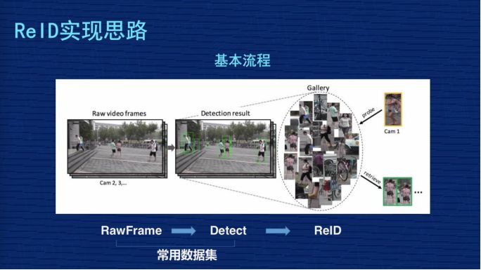 第三步,基于检测出来的行人图片,用 ReID 技术计算图片的距离,但是我们现在做研究是基于常用数据集,把前面图像的采集以及行人检测的两个工作做过了,我们 ReID 的课题主要研究第三个阶段。