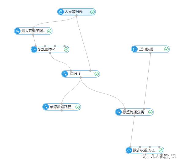 最大联通子图的功能很好理解,前面已经介绍了,图算法的输入数据是关系图谱结构的。最大联通子图可以找到有通联关系的最大集合,在团伙发现的场景中可以排除掉一些与风控场景无关的人。本次实验通过“最大联通子图”组件将数据中的群体分为两部分,并赋予group_id。通过“SQL脚本”组件和“JOIN”组件去除下图中的无关联人员。