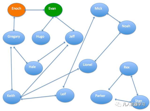 下图是已知的一份人物通联关系图,每两个人之间的连线表示两人有一定关系,可以是同事关系或者亲人关系等。已知“Enoch”是信用用户,"Evan"是欺诈用户,计算出其它人的信用指数。通过图算法,可以算出图中每个人是欺诈用户的概率,这个数据可以方便相关机构做风控。