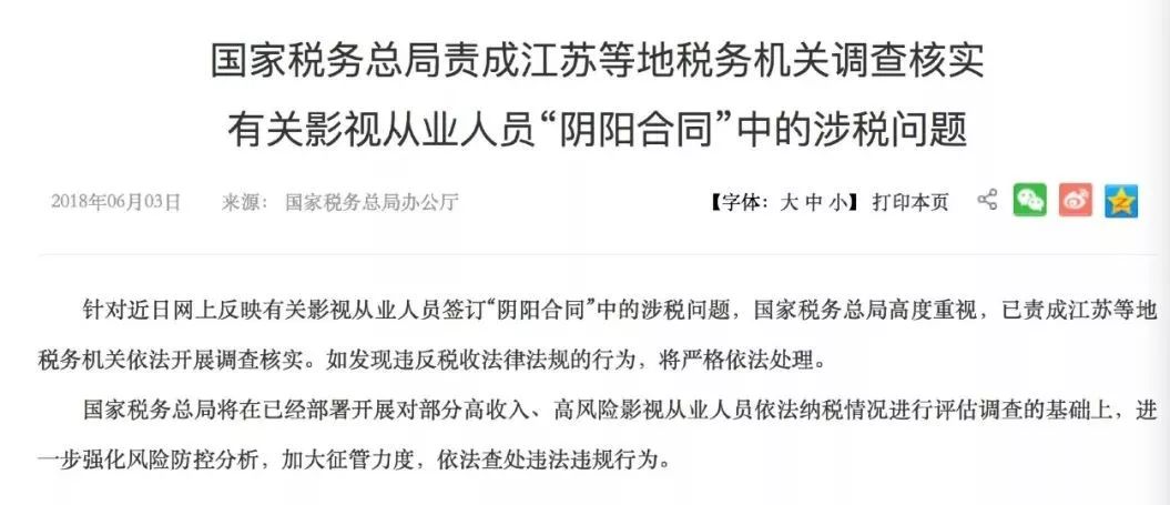 风波持续,国家税务总局发声:针对近日网上反映有关影视从业人员签订“阴阳合同”中的涉税问题,国家税务总局高度重视,已责成江苏等地税务机关依法开展调查核实。如发现违反税收法律法规的行为,将严格依法处理。