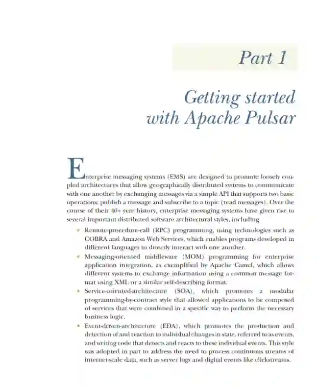 Apache Pulsar in Action教你使用Pulsar构建可扩展的流消息传递系统。您将从企业消息传递的快速介绍开始,并发现Pulsar的独特优势。下面是清晰的解释和引人入胜的示例,您将使用Pulsar Functions框架来开发一个基于微服务的应用程序。真实的案例研究说明了如何实现最重要的消息传递设计模式。