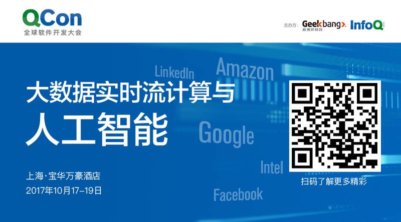 更多关于大数据实时计算的架构和应用,及如何依托实时计算框架落地的各种人工智能技术(包括机器学习和深度学习),请关注 QCon 上海 2017。点击 阅读原文 探索 Facebook、Uber、Streamlio、阿里巴巴、腾讯等公司的实践经验。QCon 上海站即将举行,点击 阅读原文 与技术大咖零距离,获得技术点拨。如果在报名过程中有任何问题,欢迎联系购票经理 Hanna ,电话:15110019061,微信:qcon-0410。具体详戳 「 阅读原文 」