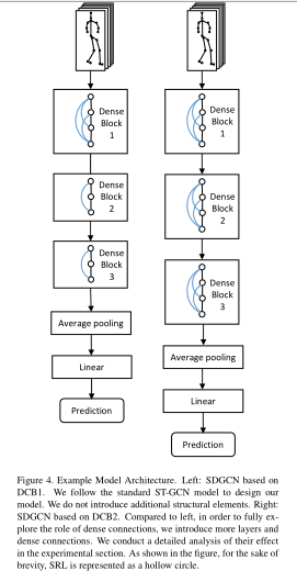 从DenseNet中受到启发,文中在时空图卷积网络中引入了密集连接,下图为一个密集连接块的示例,每一个SRL层的输入特征都与先前的SRL层的输出特征有关。