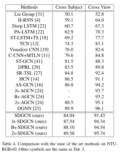 文中也在两个数据集上对比了SDGCN与其它基准模型的效果,如表3与表4所示,可以看到2s-SDGCN的性能优与大部分的基准模型。