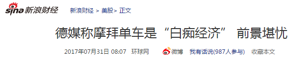 德国“经济周刊”报道认为中国大陆共享单车的前景堪忧,大多数公司尽管发展迅速、吸引了许多投资,却赚不了钱。报道估算,每辆共享单车价值280欧元,每天必须使用5次,才能在一年内达到损益平衡。而摩拜单车的顾客平均4天才借一次车,且每小时才人民币1元的价格太便宜。