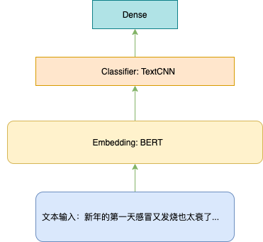 首先文本数据 shape = (None, max_len) 经过 Embedding 层后,shape = (None, max_len, embedding_dim) 此时文本被表征为一系列的向量,后接 TextCNN 后可以变成 shape = (None, dim) 目的是把一系列的向量编码成一个向量,并且这个向量包含了整个文本的语义信息,最后接 softmax 就可以得到三分类的概率分布了。