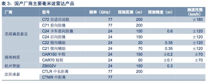 国内毫米波雷达产品在精度、探测距离方面相对落后,24GHz已取得快速进展。目前,芜湖森思泰克,湖南纳雷、亚太股份的杭州智波等企业已推出多款产品化的77GHz、24GHz毫米波雷达,华域汽车、南京隼眼等企业也在进行相关的产品研发。