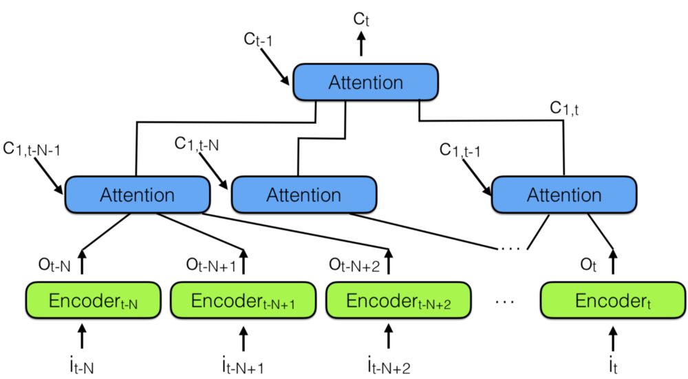 这时候,“层次型神经注意力编码器”应运而生,结合了多个神经注意力模块,如下图所示: