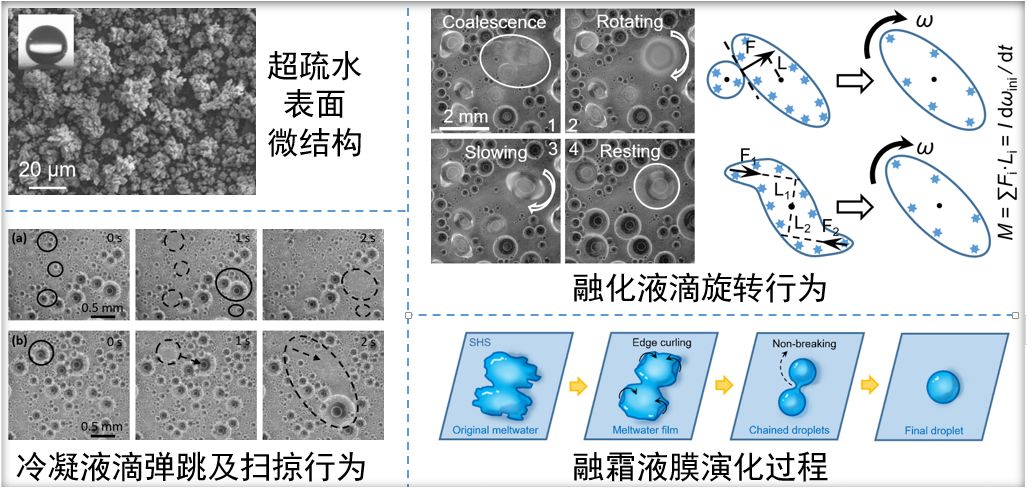3. 超疏水表面冻结液滴融化过程中的运动行为观测、建模与分析,以及融化液滴行为对表面排液的影响研究;超疏水表面融霜过程中融霜液膜的演化规律研究,融霜液膜特殊演化现象的机理分析。