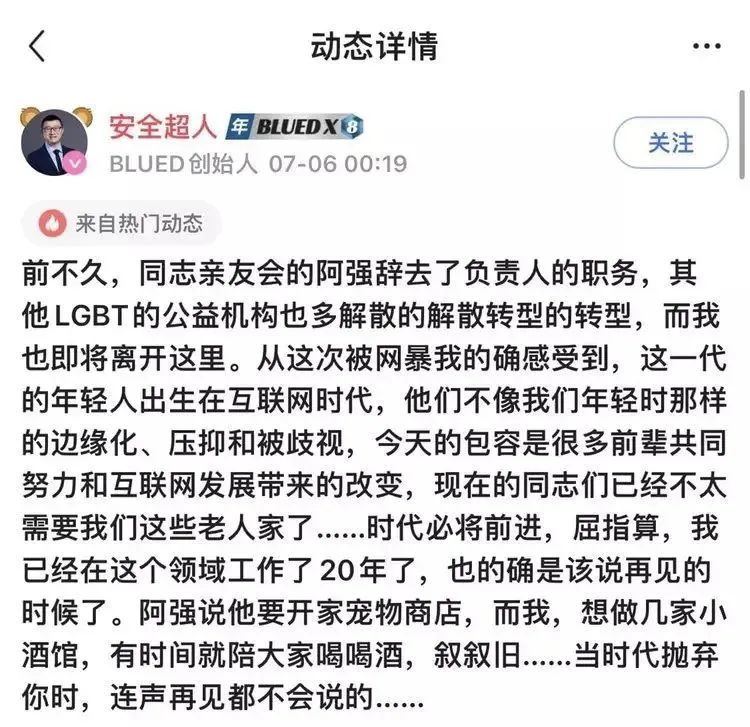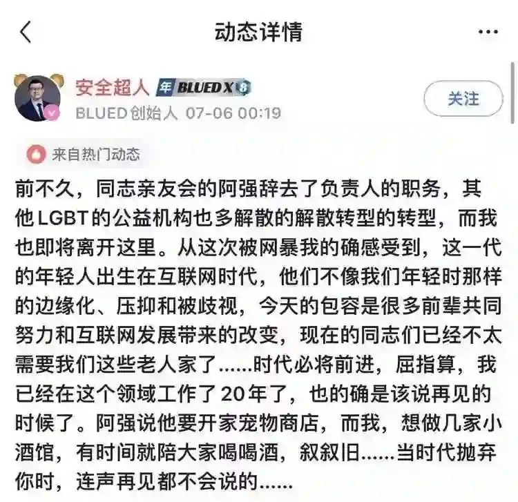 【创始人马保力卸任Blued法定代表人】近日,Blued关联公司北京蓝城兄弟文化传媒有限公司法定代表人、主要成员发生变更,创始人马保力卸任该公司法定代表人、经理职位,孙俊辰、李智勇退出执行董事、财务负责人职位,分别由苏鉴、吕晓楠接任。此前,创始人马保力(淡蓝耿乐)在Blued社交软件上发布动态,表示将正式离开Blued。(财经网)