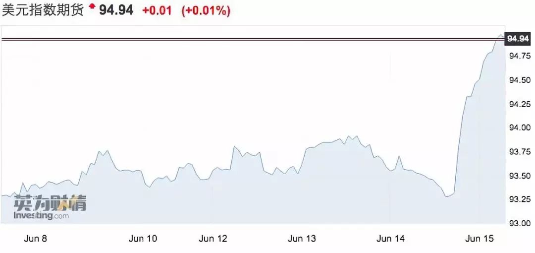 此后的交易时段中,由于欧洲央行的鸽派表态,美股大涨,美元强势上攻至95附近,欧元兑美元大跌,新兴市场货币遭遇抛售、股市大跌。截至收盘,美国科技股普遍上涨,亚马逊、奈飞和Facebook等多家科技公司创历史新高;截至6月15日9点30分,欧元/美元从开会前1.18的高点暴跌至1.15附近,美元指数大涨至94.94;6月15日,人民币中间价下调344点报6.4306,为逾四个月最大降幅。