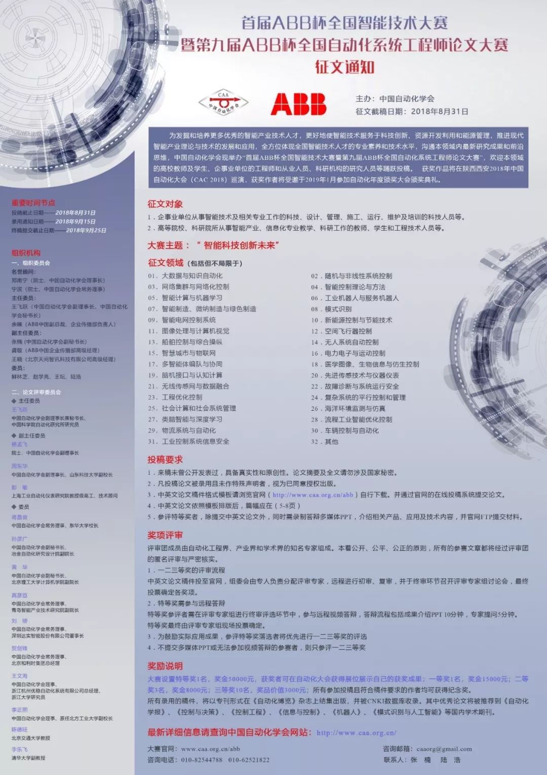 人工智能是互联网下一轮升级和变革的核心引擎,将催生新的业态和商业模式,引发产业结构的深刻变革。为发掘和培养更多优秀的智能产业技术人才,更好地使智能技术服务于科技创新、资源开发利用和能源管理,推进现代智能产业理论与技术的发展和应用,全方位体现全国智能技术人才的专业素养和技术水平,沟通本领域内最新研究成果和前沿思维,中国自动化学会现举办“首届ABB杯全国智能技术大赛暨第九届ABB杯全国自动化系统工程师论文大赛”。
