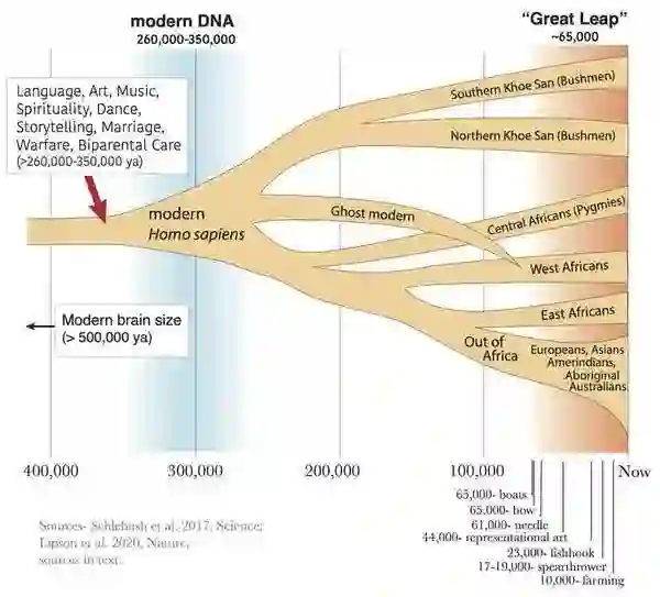 化石和脱氧核糖核酸表明,智人大约早在30万年前就进化了。然而考古发现,人类复杂的技术和文化,以及「行为现代性」是在5万-6.5万年前发展而来的。