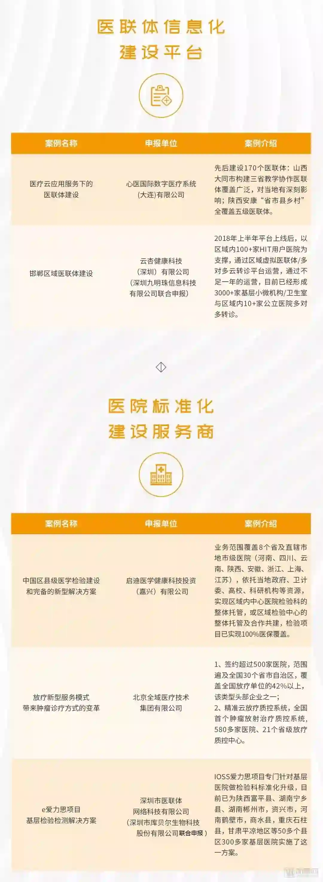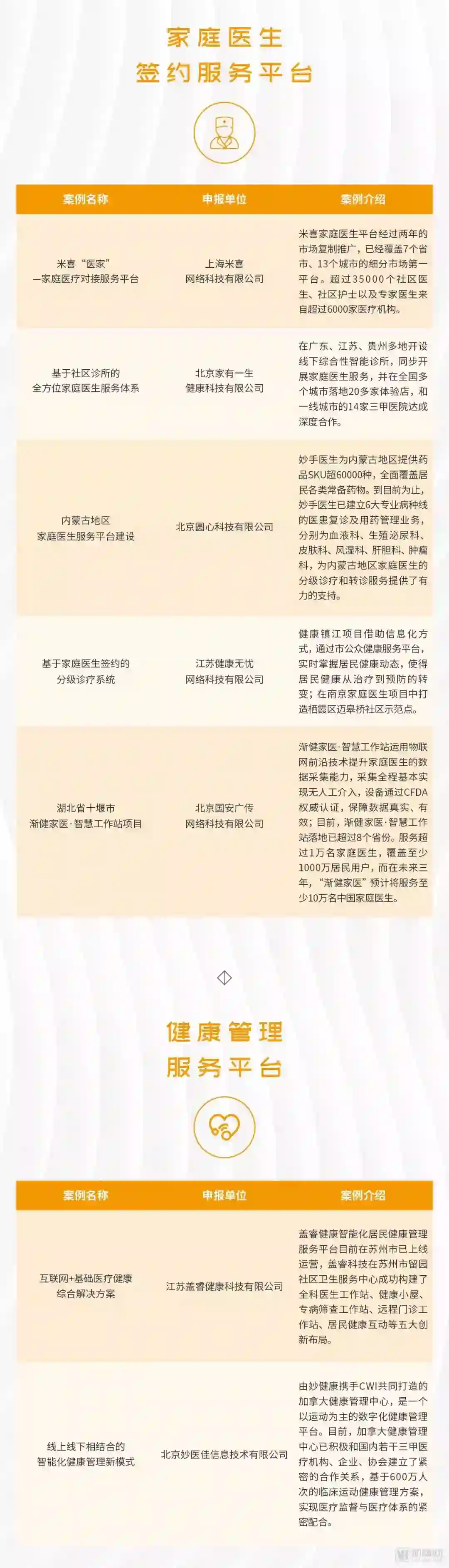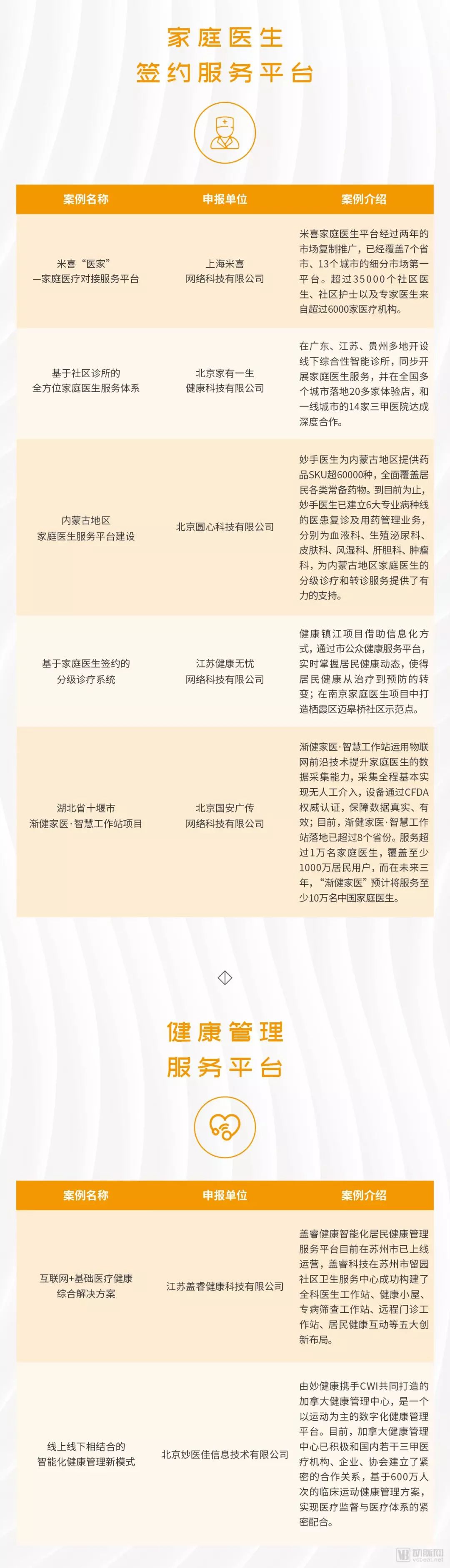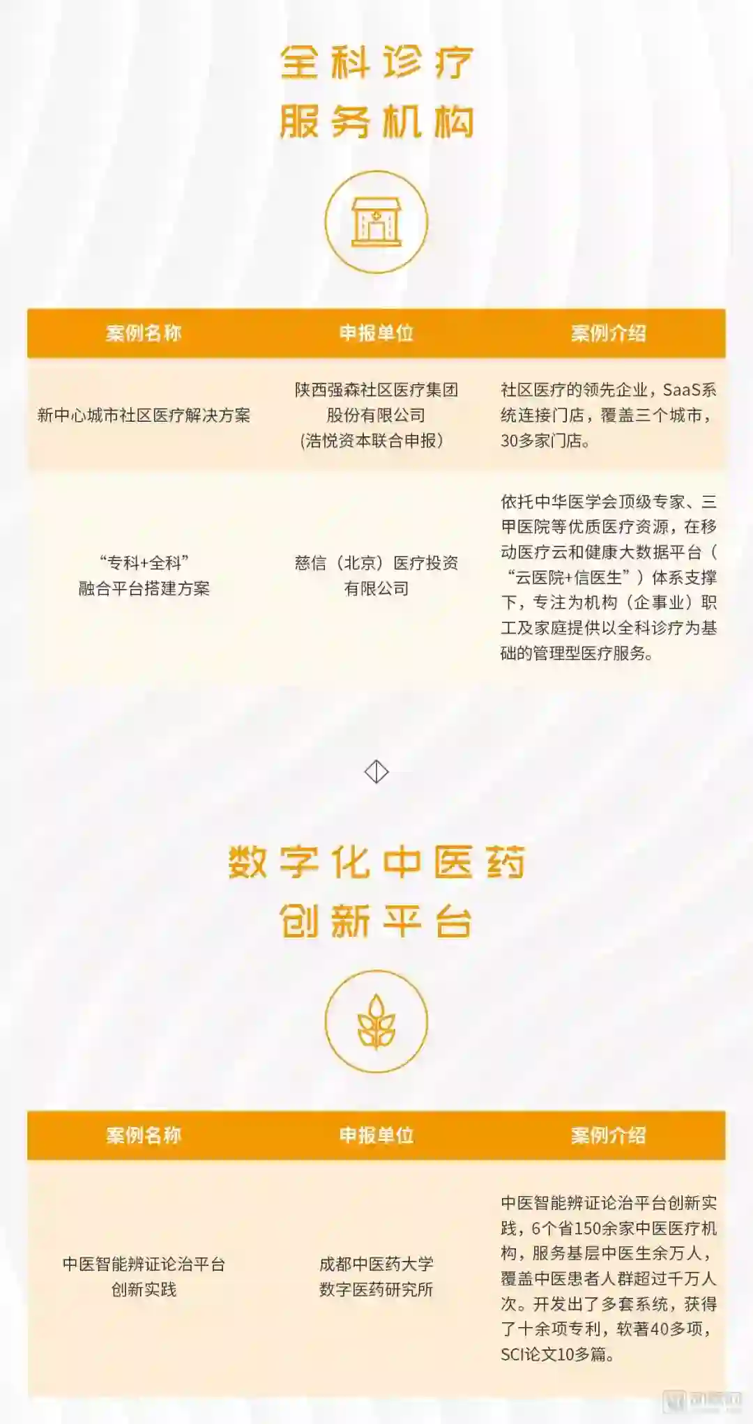 上榜案例涉及领域分别为:家庭医生签约服务平台、健康管理服务平台、全科诊疗服务机构、数字化中医药创新平台、医联体信息化建设平台、医疗标准化建设服务商、诊疗能力提升赋能工具、智慧即时检测工具、智慧药事服务平台、智慧医养创新服务平台、智慧医院信息化建设服务商、专科运营创新服务商。