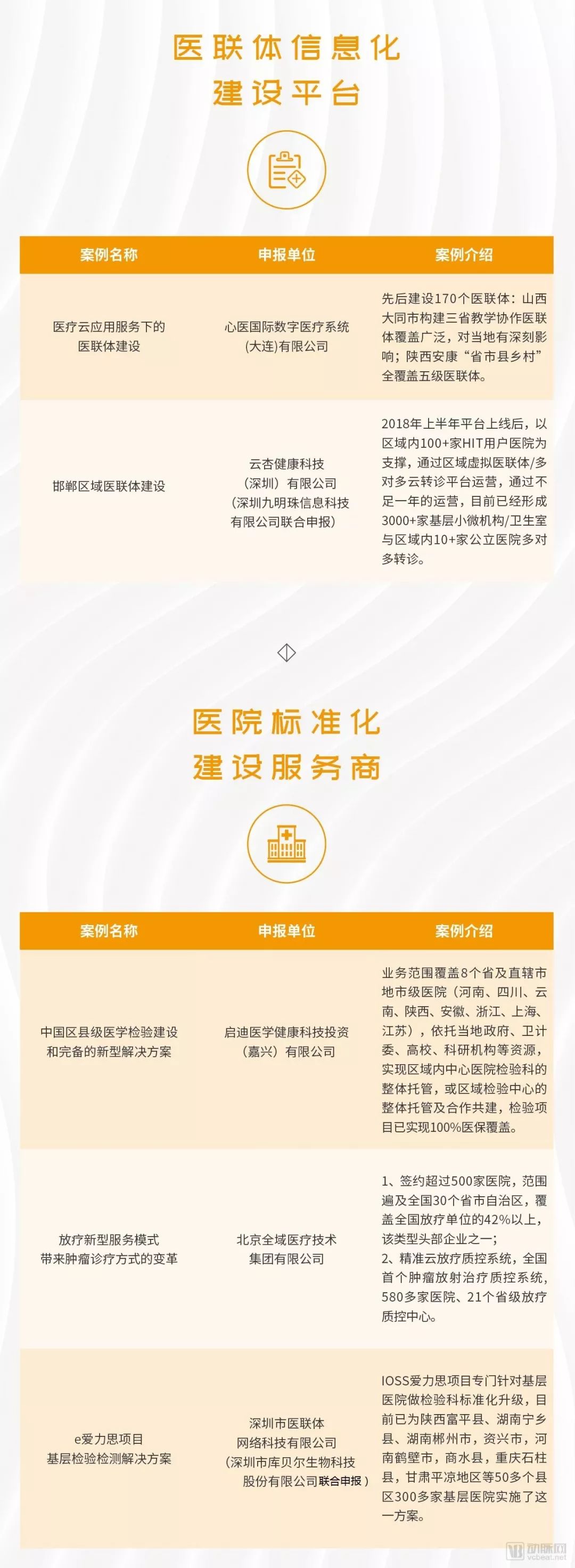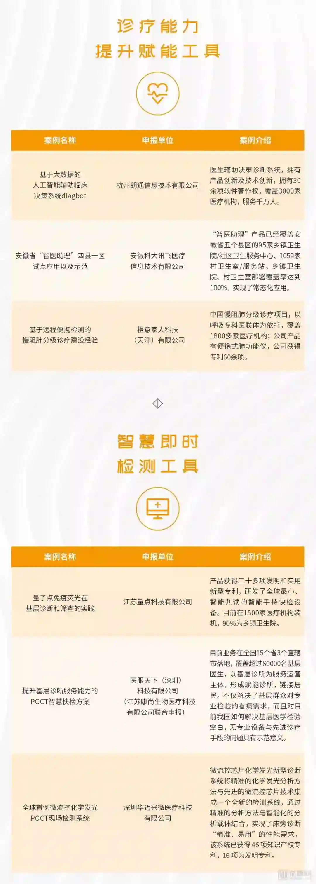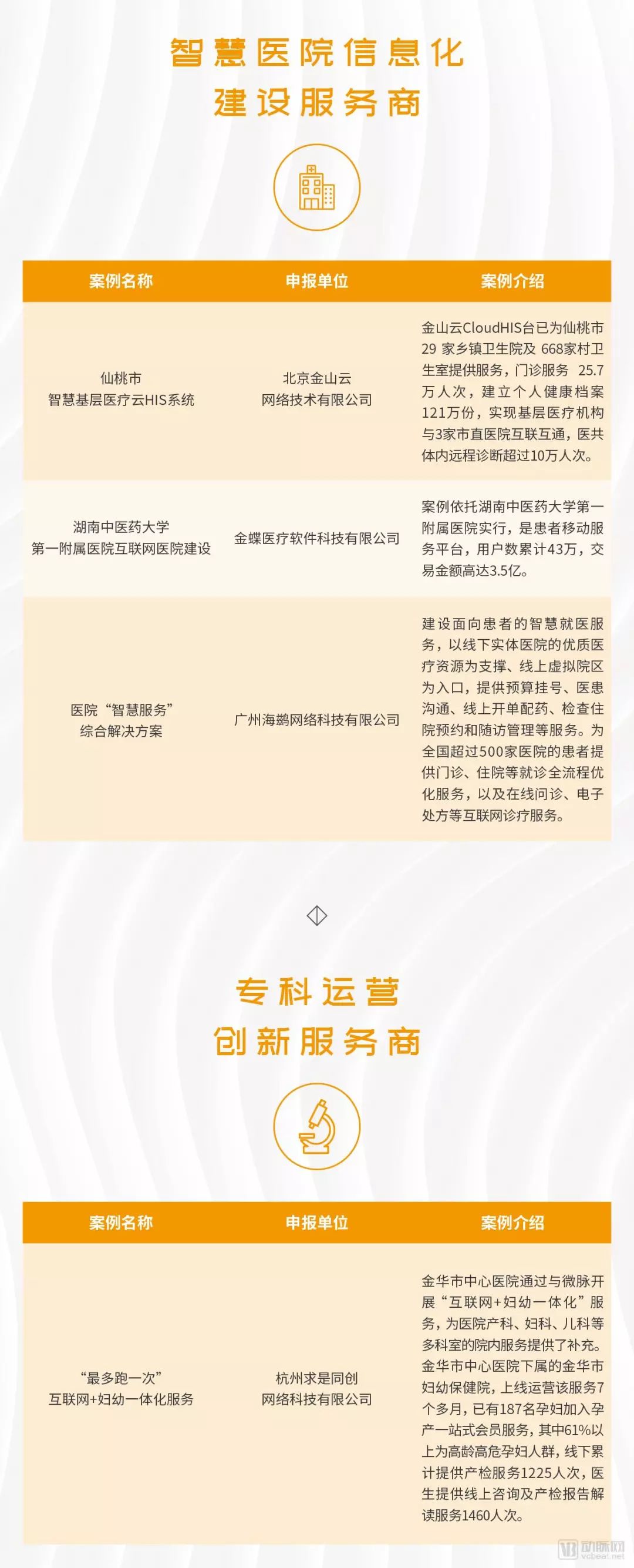 上榜案例涉及领域分别为:家庭医生签约服务平台、健康管理服务平台、全科诊疗服务机构、数字化中医药创新平台、医联体信息化建设平台、医疗标准化建设服务商、诊疗能力提升赋能工具、智慧即时检测工具、智慧药事服务平台、智慧医养创新服务平台、智慧医院信息化建设服务商、专科运营创新服务商。