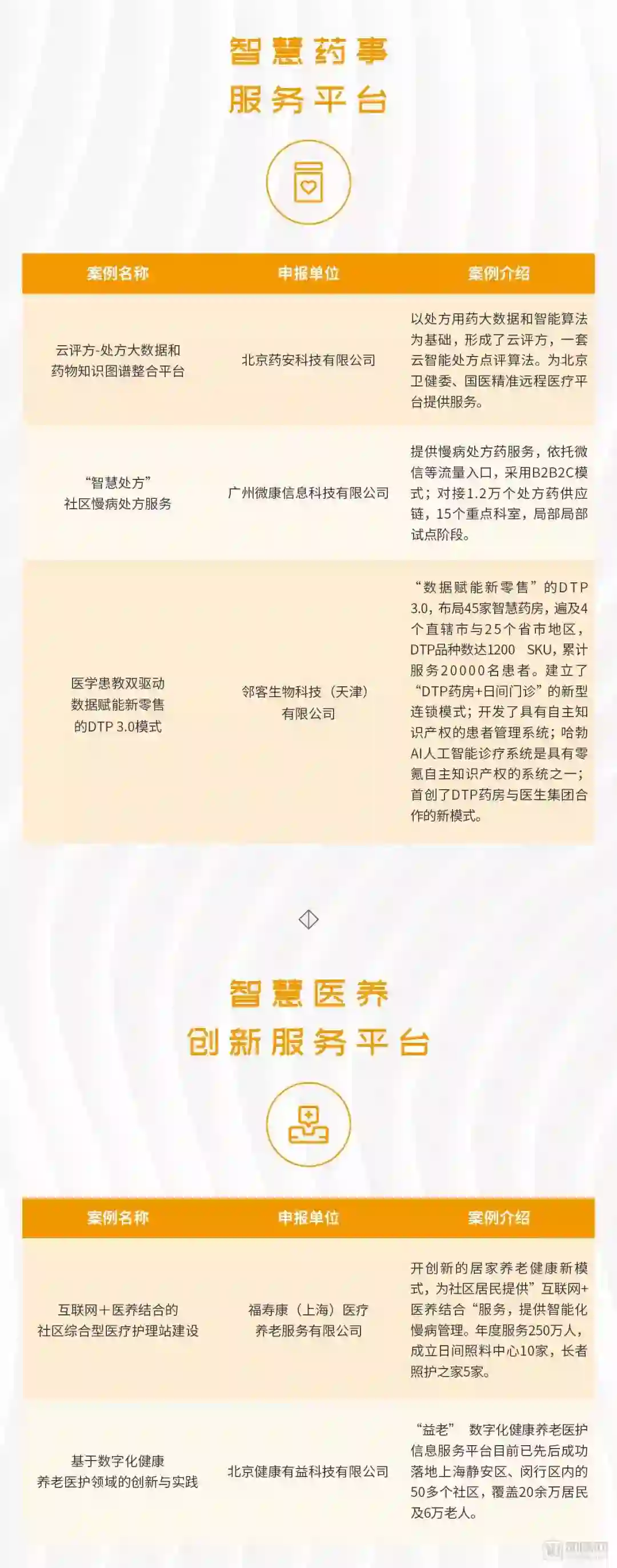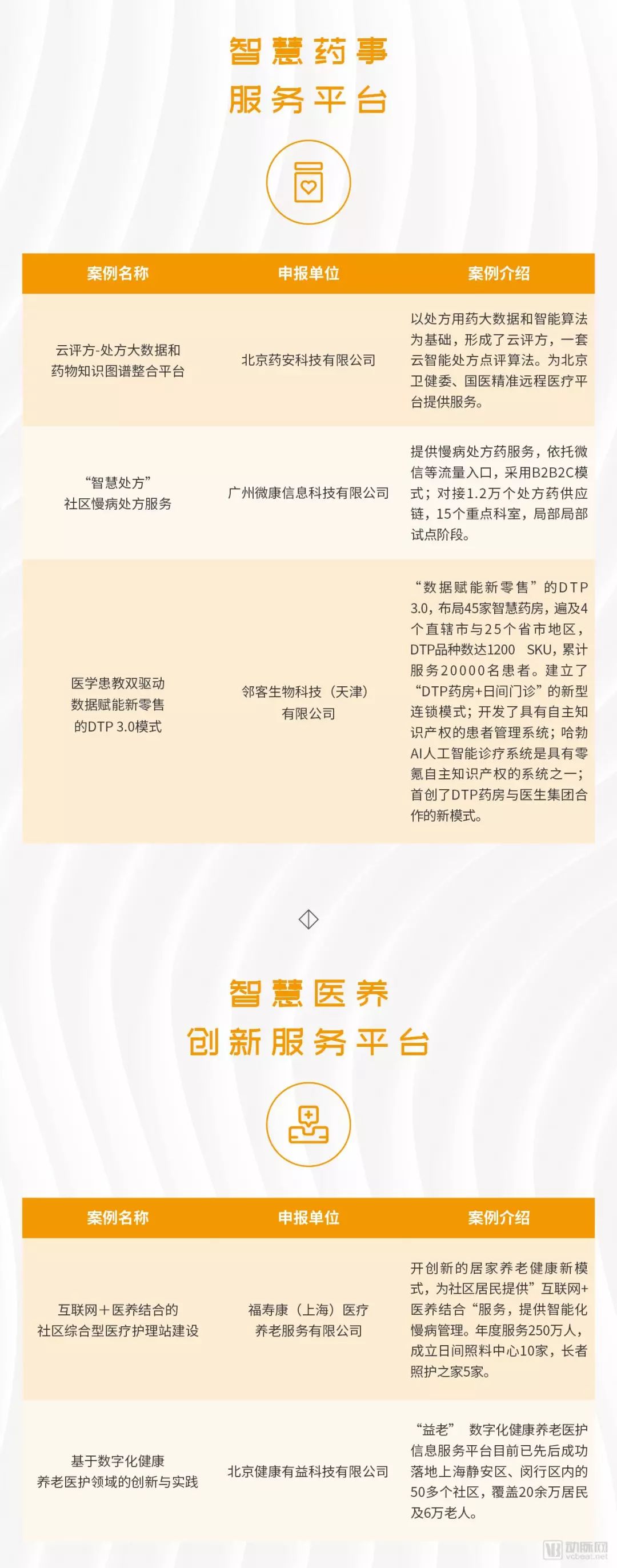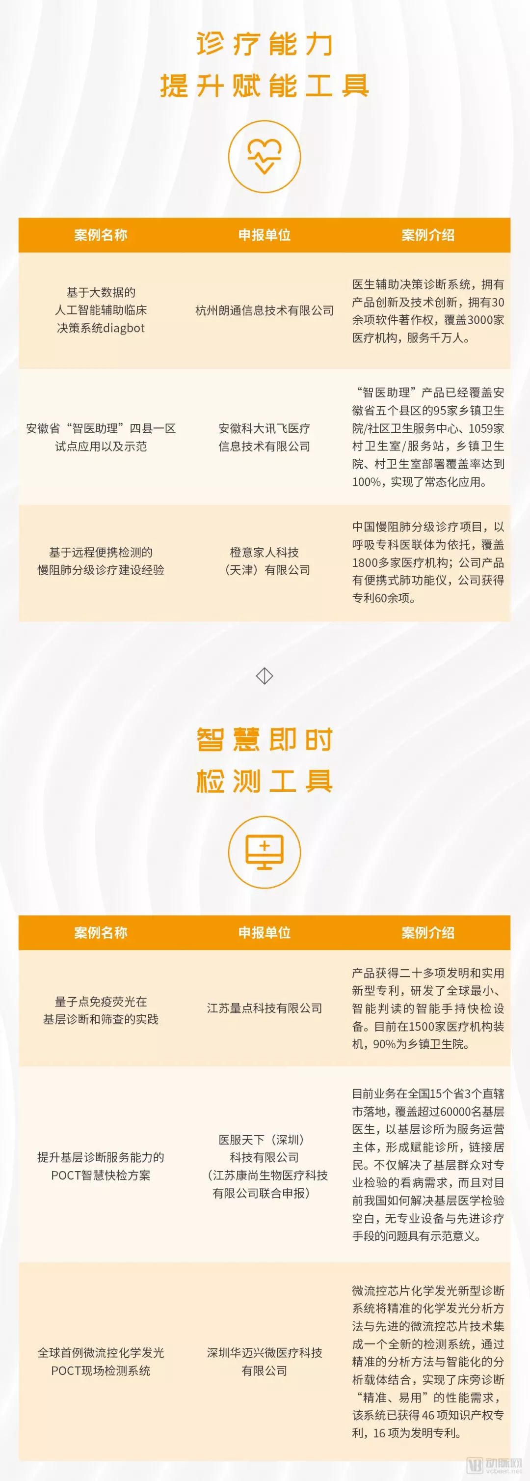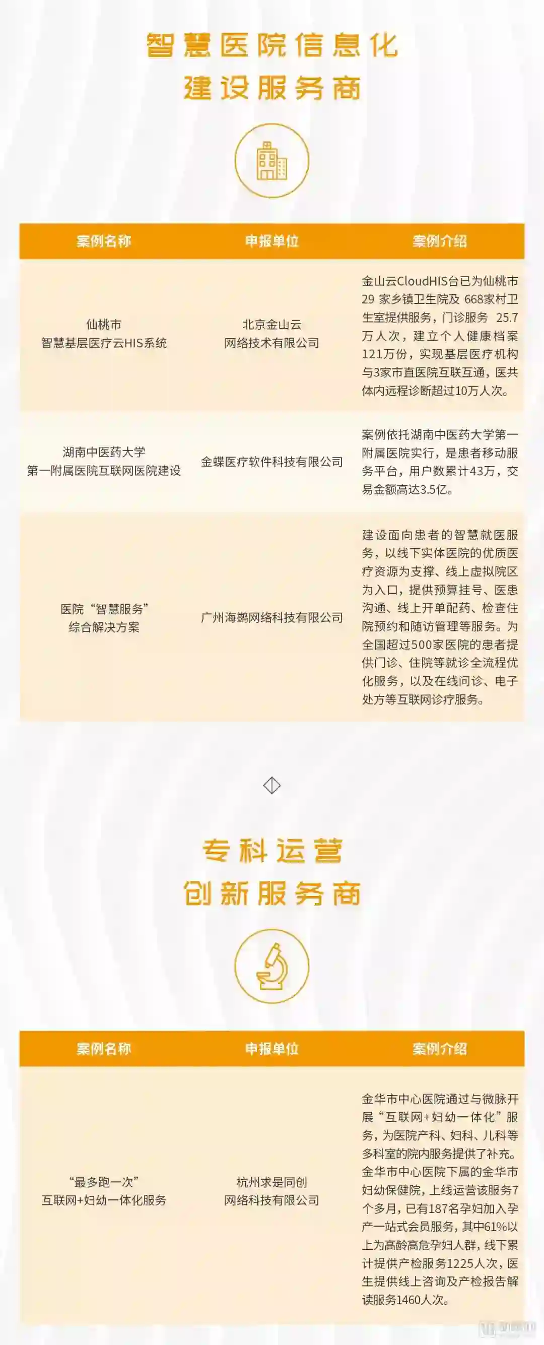 上榜案例涉及领域分别为:家庭医生签约服务平台、健康管理服务平台、全科诊疗服务机构、数字化中医药创新平台、医联体信息化建设平台、医疗标准化建设服务商、诊疗能力提升赋能工具、智慧即时检测工具、智慧药事服务平台、智慧医养创新服务平台、智慧医院信息化建设服务商、专科运营创新服务商。