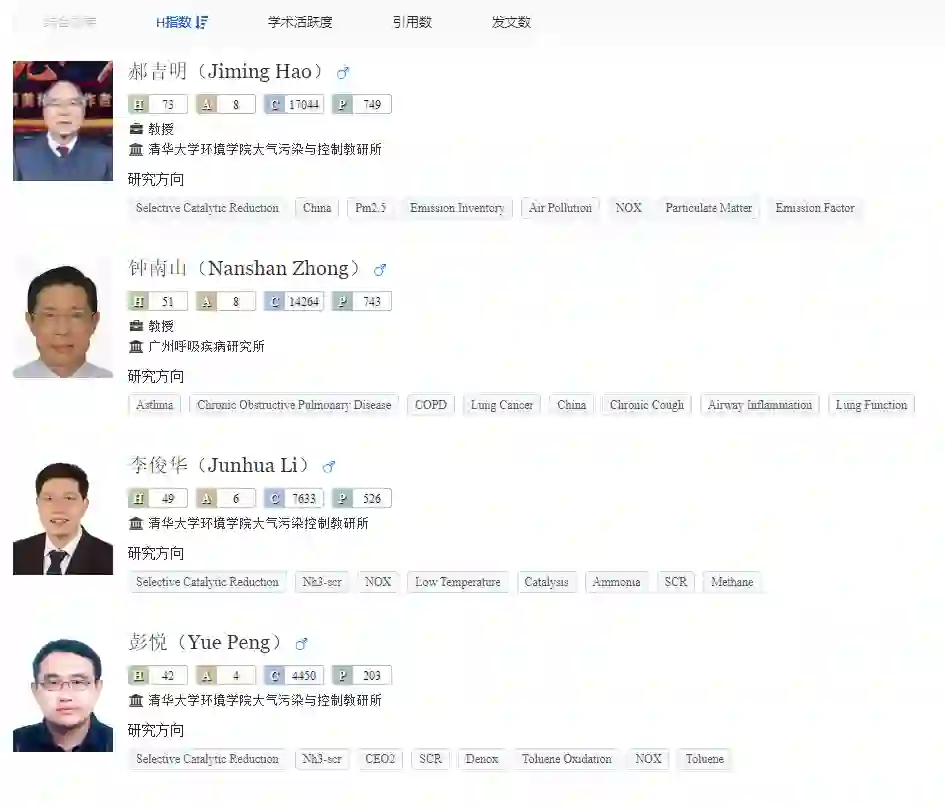 在主界面上,以 H(H 指数)、A(学术活跃度)、C(引用数)、P(发文数)四大维度来展示学者的研究指数,同时提供个人基本信息及研究兴趣。