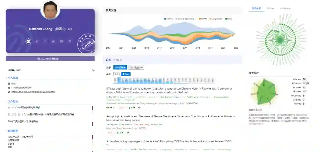 学者个人链接中还有更为详细的学术信息,包括视觉性呈现的学术生涯迁徙图、网络关系、研究兴趣、作者统计四大模块以及文字性呈现的基本信息、学术成果、代表成果解析、人才动态及专家情报五大模块,共计九大个人学术生涯解读模块。