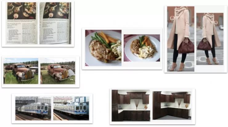 我们将我们图片库中的所有图片划分为不同的图片类,每一类都由几近相同(以人类观察员的判断为标准)的图片组成。这种分类标准有一定的主观性,为了给你一个感性认识,下图展示了一些按照 NearDup 阈值进行图片分类的例子。注意,这些相似图片不一定来自同一图像源(参见右下图),也不一定有相同的背景(参见左下图)。同时,图像中可能包含一定的几何扭曲(参见左上图),或者旋转、剪切和翻转变化(见中心图和右上图)。