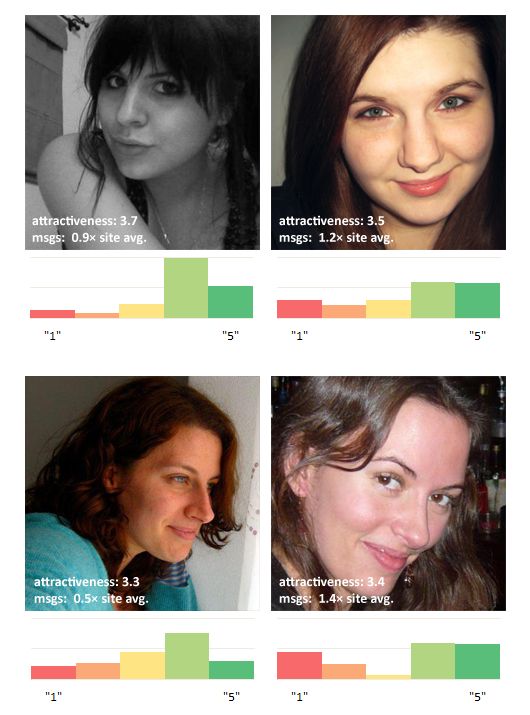 ),收到喜欢率相对颜值稍微有左移一些 ( 来自于OkCupid Blog )。
